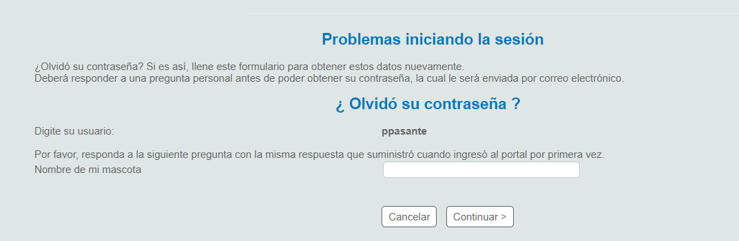4) Indique la respuesta de identificación personal que ingreso cuando inició sesión por primera vez, luego haga clic en continuar.